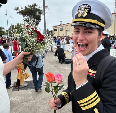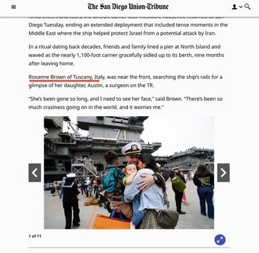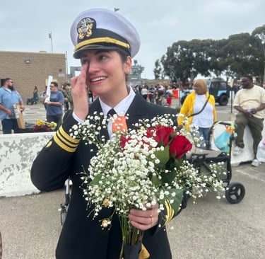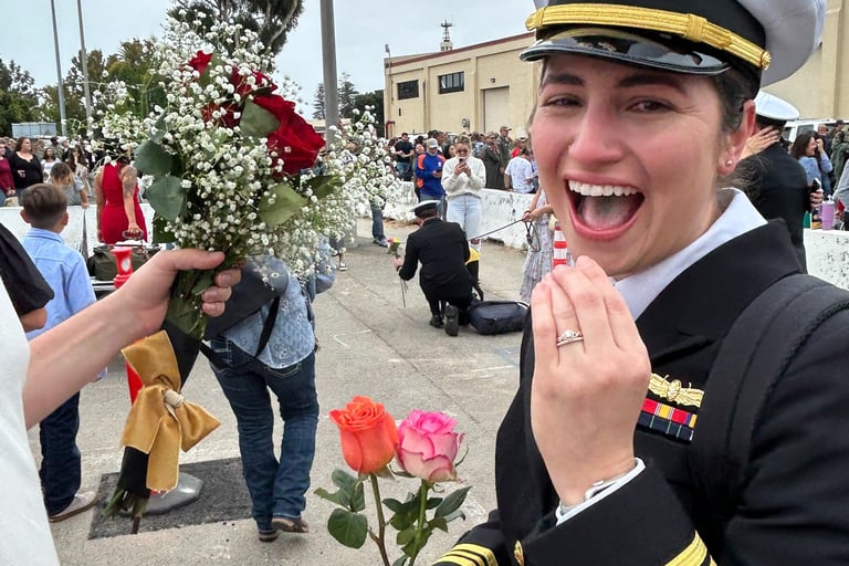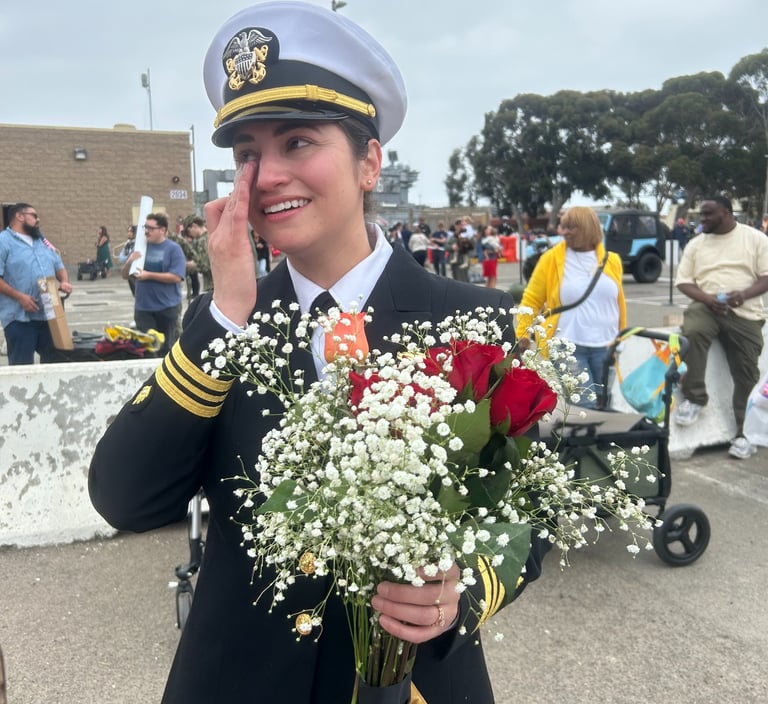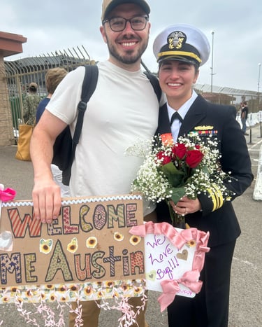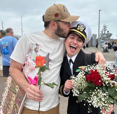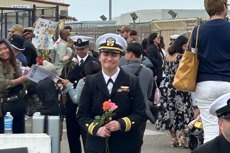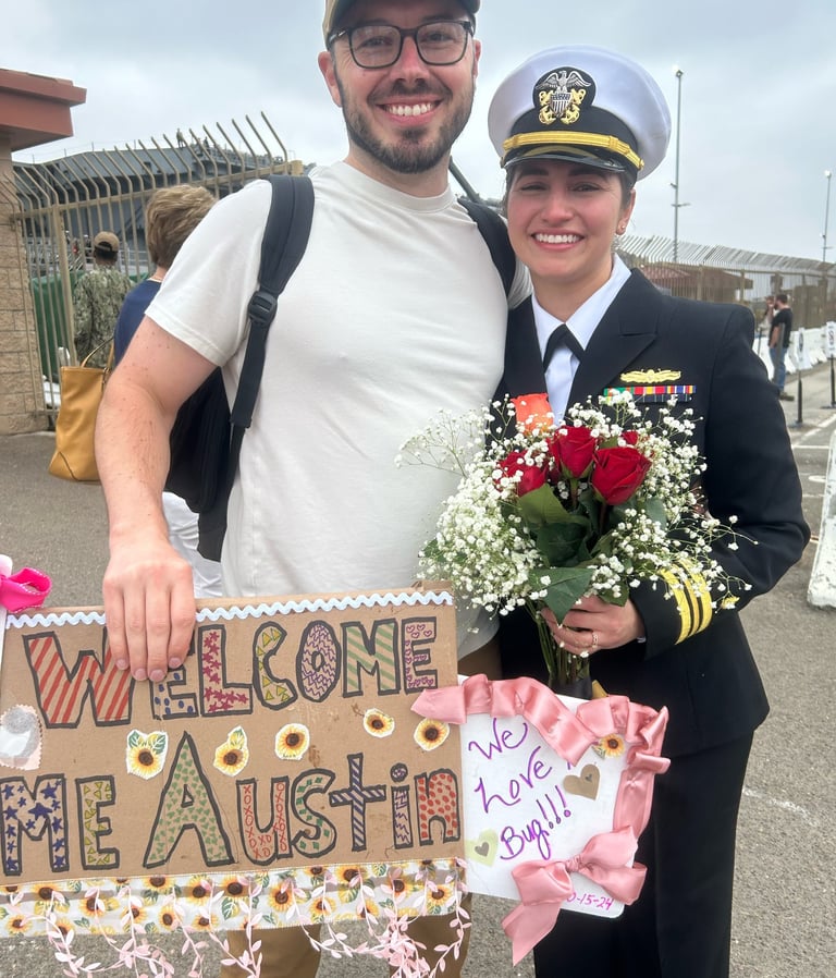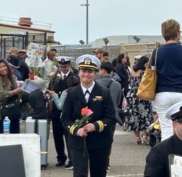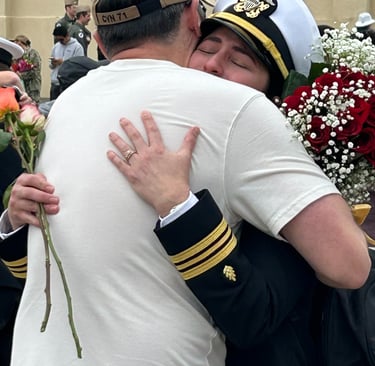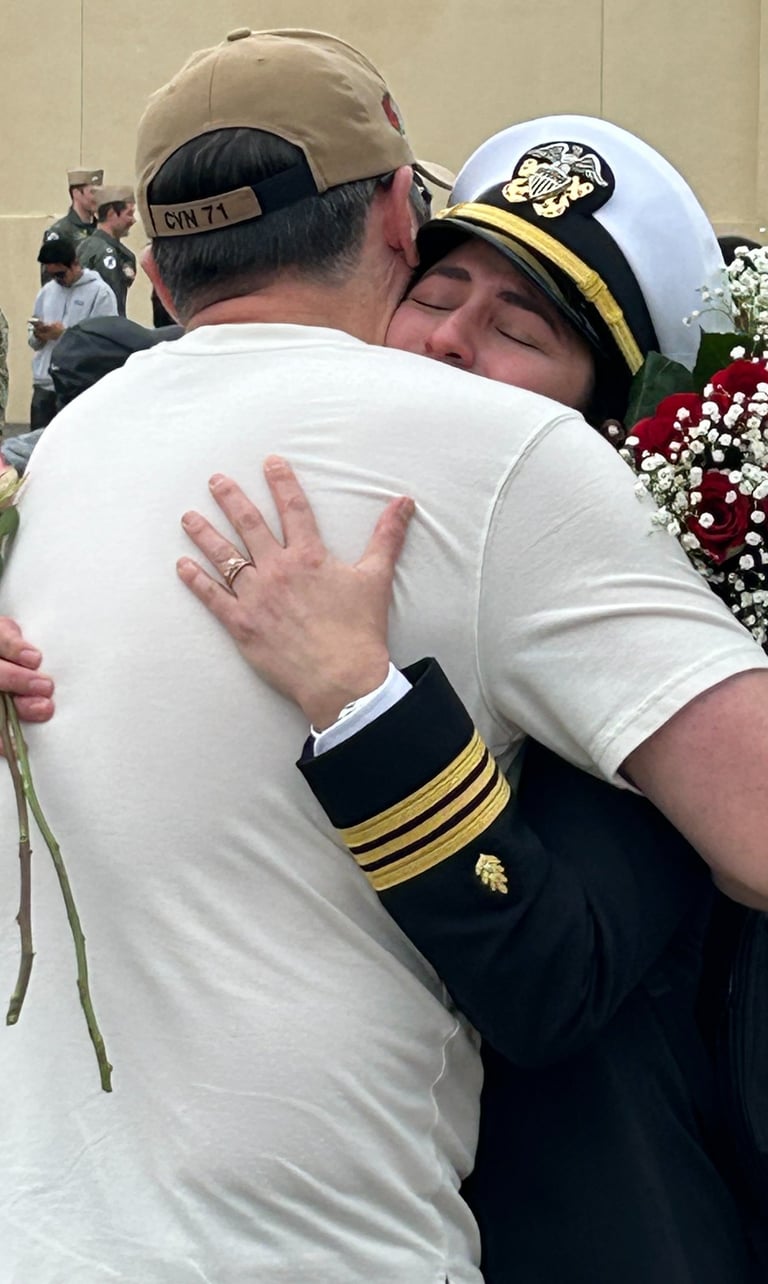 After leaving port in Coronado California in January, the Theodore Roosevelt finally pulls into port on October 15, 2024. Kyle and I have spent two days getting the house ready for Austin's homecoming. In the time she has been deployed, Kyle has secured a new residence for them. They were only married for five months before Austin's deployment. We are both so excited to see her. What an emotional day it was. Seeing sailors getting off the ship that have never seen their new babies, seeing toddlers running toward their mom or dad. I was interviewed by a news station and newspaper which will be attached. A picture is worth a thousand words so here are the pictures...