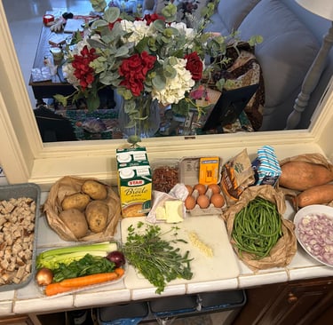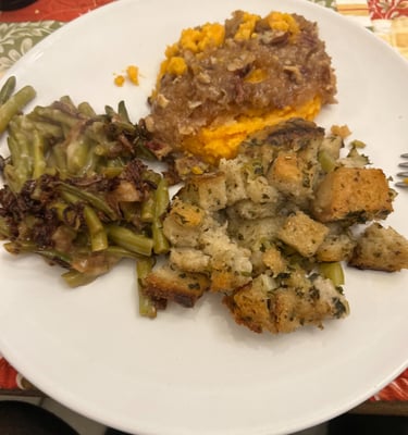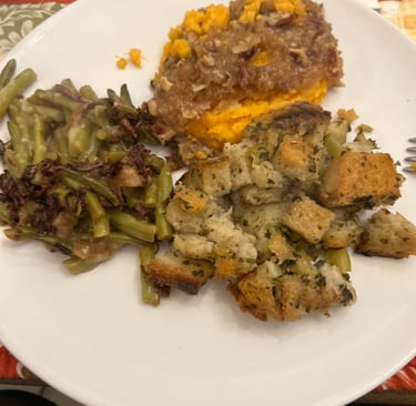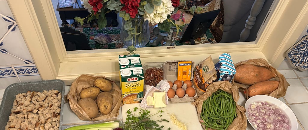 Soooo...Thanksgiving in Italy is rough! You can't buy Campbells soup and French's green beans for your casserole. They don't have Mrs. Cubbison's Stuffing in a box. So this is what I did. I soaked shallots overnight per my son Ryan's instructions and my house smelled to high heaven. The next day they were fried. Okay I have topping. I had to make homemade cream of chicken soup. Very pasty at first, but finally got it (about 4 quarts because I kept adding too much broth then too much flour!) The herbs were picked from my herb garden, yes I am growing herbs. Sweet potatoes a piece of cake. If they have an abundance of anything in Italy it is vegetables.