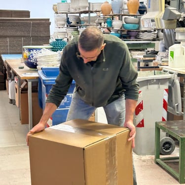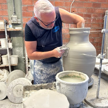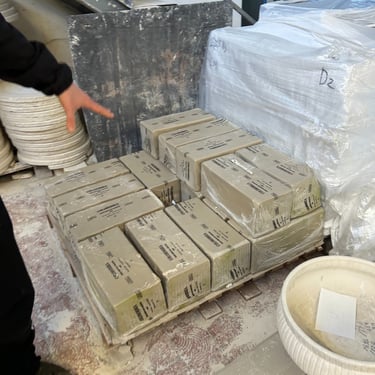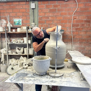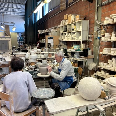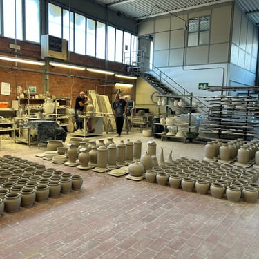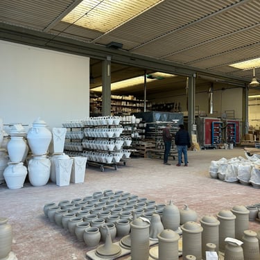 Today was the best day I've had in the four months I have been in Italy. I returned to Montelupo to meet Matteo (see previous blog) and get a tour of his factory, Via Galleria. What an incredible experience. The factory imports to the US to Neiman Marcus, Pottery Barn, Crate & Barrel, William Sonoma and on and on. If there is Italian Ceramics it is most likely from their factory in Montelupo. Matteo and his father Salvatore, his mother Elizabeth (Betty), and his brother Marco run this facility that has been in the family for 5 generations. Salvatore is a master craftsman and watching him spin the potting wheel and create a 2' ceramic pot in mere minutes was astounding. There is one man who is strictly in charge of putting handles on pots that require them. There are approximately 5 painters that hand paint the pottery and one gentleman who packs them in boxes and places them on pallets for shipping. What is astounding is the volume of pots that this small crew produces. Matteo showed me how they start with blocks of clay and then put it in what used to be a mixer for a bakery. The mixed clay is then put on the wheel and the magic happens. Marco removes the completed pot and stacks it on a pallet to dry.